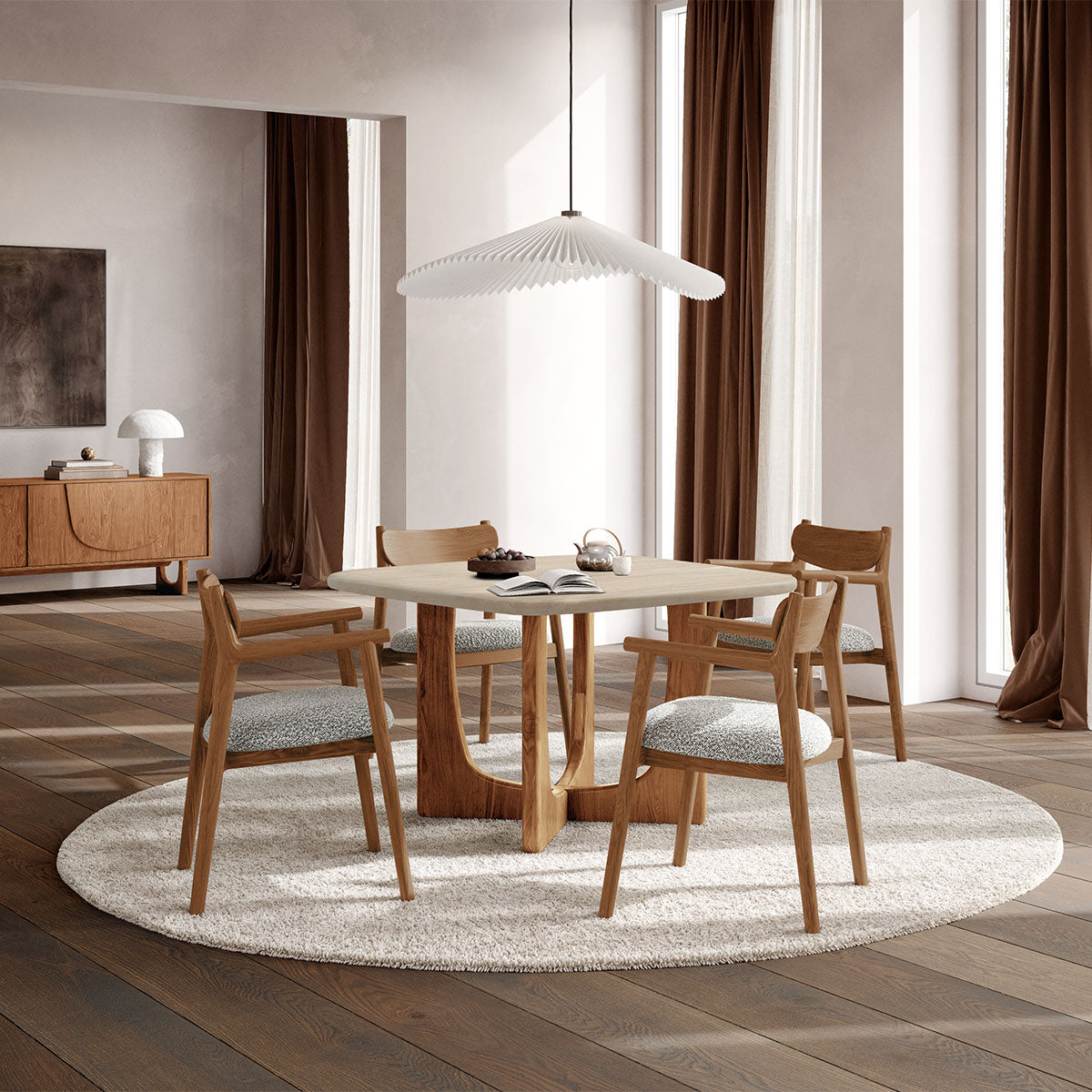 Avec sa base sculpturale et ses riches textures naturelles, la table à manger en travertin Pierro apporte une élégance discrète à tout espace repas. Dotée d'un plateau circulaire en chêne Bianco et d'un piédestal en travertin aux tons jaunes doux, cette pièce est à la fois fonctionnelle et raffinée. Sa palette chaleureuse et naturelle et ses lignes géométriques créent une pièce maîtresse sophistiquée, idéale pour les intérieurs contemporains à la recherche d'un mélange de matériaux intemporel et d'une silhouette visuellement saisissante.